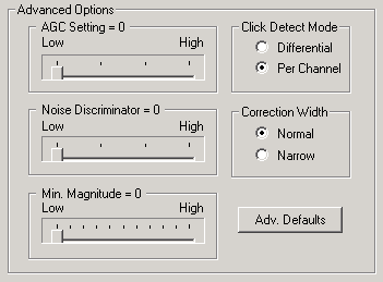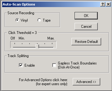 The following 'Advanced' options should only be altered by expert users. They are provided to help prevent the incidence of 'False Positives', ie places where components of ordinary music are detected as clicks. Most of these settings allow you to selectively reduce the click detection sensitivity. Click over an item for further information.