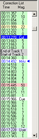 The list shows the timestamp of the correction together with the magnitude of the underlying click as determined by Wave Corrector. If a track has been selected, the timestamp shows the time measured from the start of the track; otherwise it shows the time from the start of the wave file.