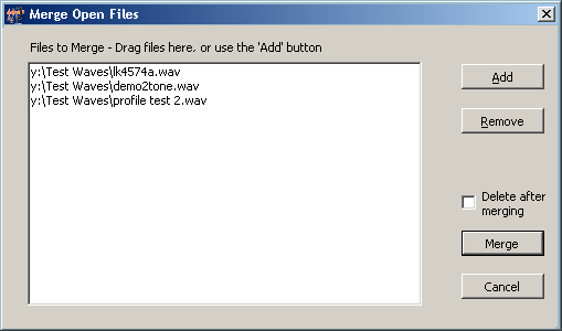 Use this command to merge two or more wave files prior to processing. For example, if you make two separate recordings of the two sides of an LP, you can use this command to combine them into a single file.