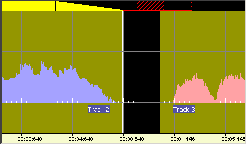 When a track boundary is selected, a vertical white line denotes the position of the boundary. A vertical black band indicates the gap between the end of one track and the beginning of the next. At the top of the display, a horizontal bar indicates the track fade-in or fade-out settings together with a pre- or post-track silence period. The triangular part of the yellow bar denotes the fade period; the hatched red bar denotes the silence period.