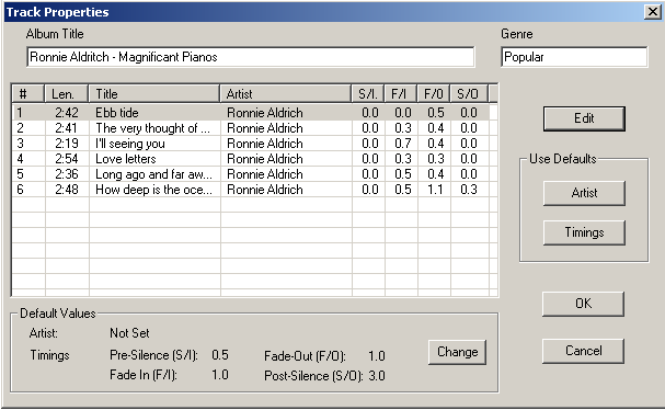 You can also use this dialogue to set one or more tracks to the program's default values. To do this, highlight the tracks you wish to set and click one or both of the 'Use Defaults' buttons.