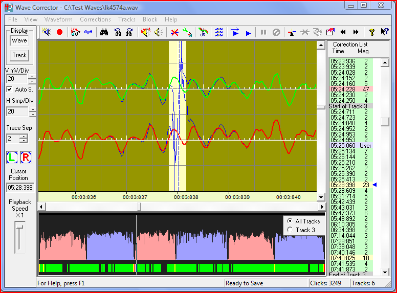 To the right is the Correction List window that lists all click corrections applied by the program. These corrections are colour coded according to the estimated severity of the click. Track boundary markers are also listed in this window.
